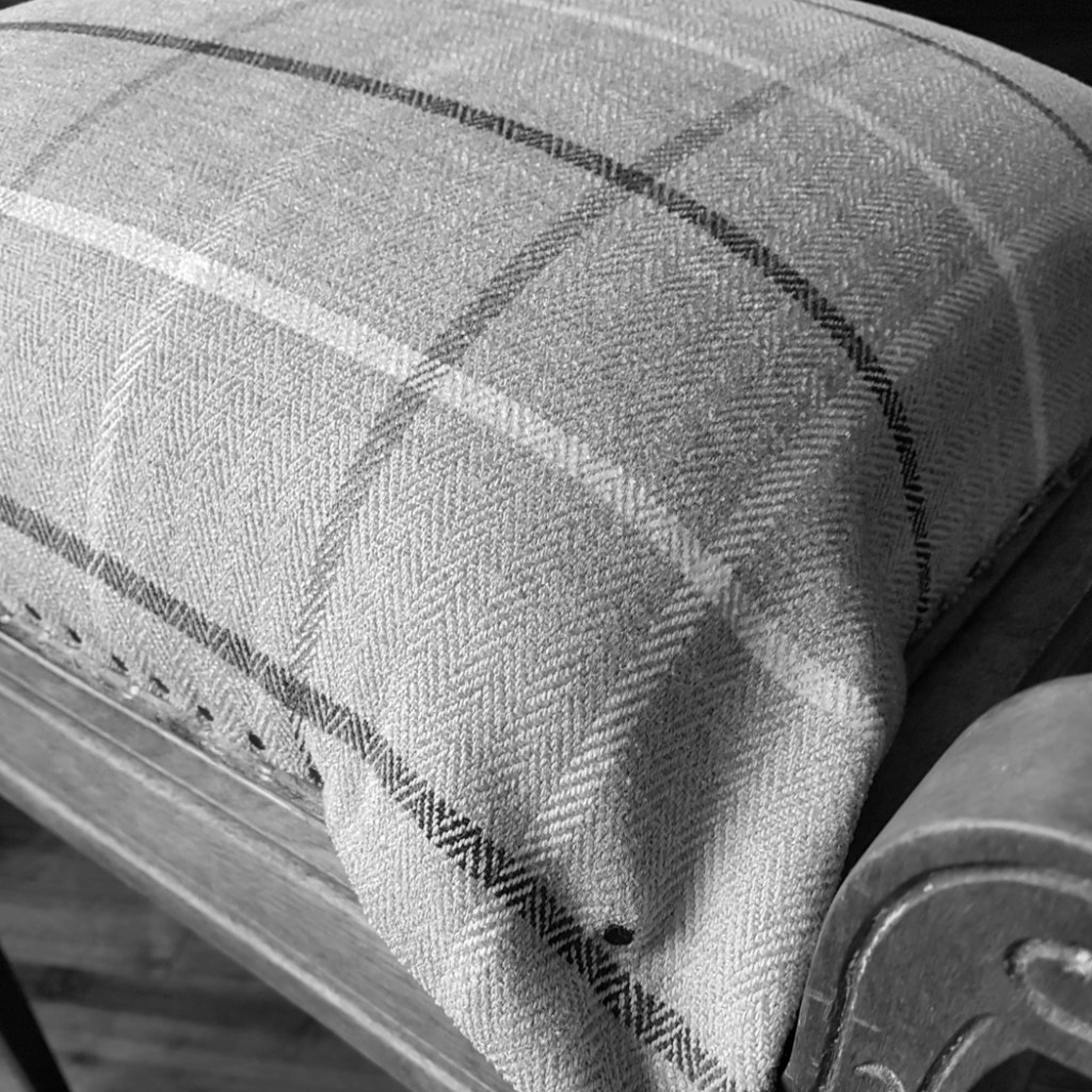 It consists of covering the seat with a solid white cotton canvas to isolate the upholstery from the final fabric. The canvas is maintained at the level of the wooden rebates.