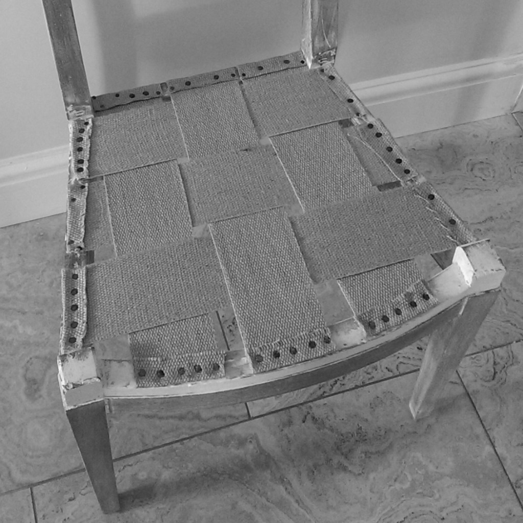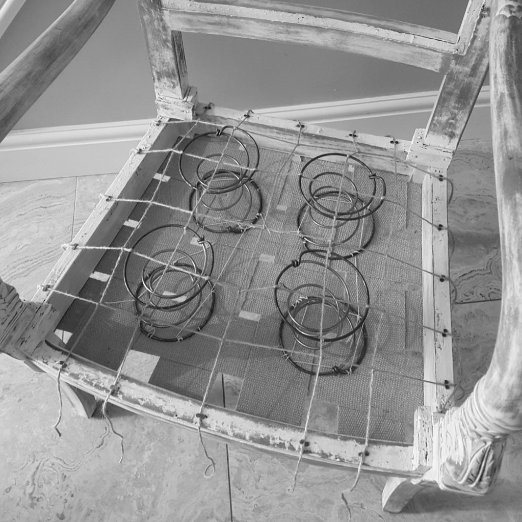 The webbing is the base of the seat. Made with crisscrossed jute straps, this seat base must be tight enough to receive all of the upholstery and support the weight of the seat. This is key moment.