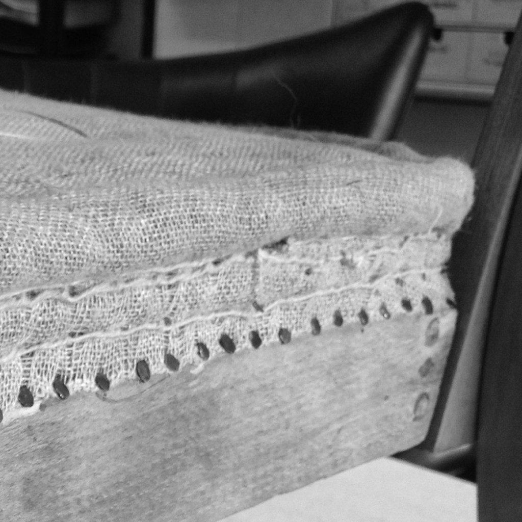 Burlap fabric tightly woven, the strong canvas is nailed to the seat to slightly hold the springs by hooking points. But also to accommodate the horsehair which will be maintained with laces sewn in advance.